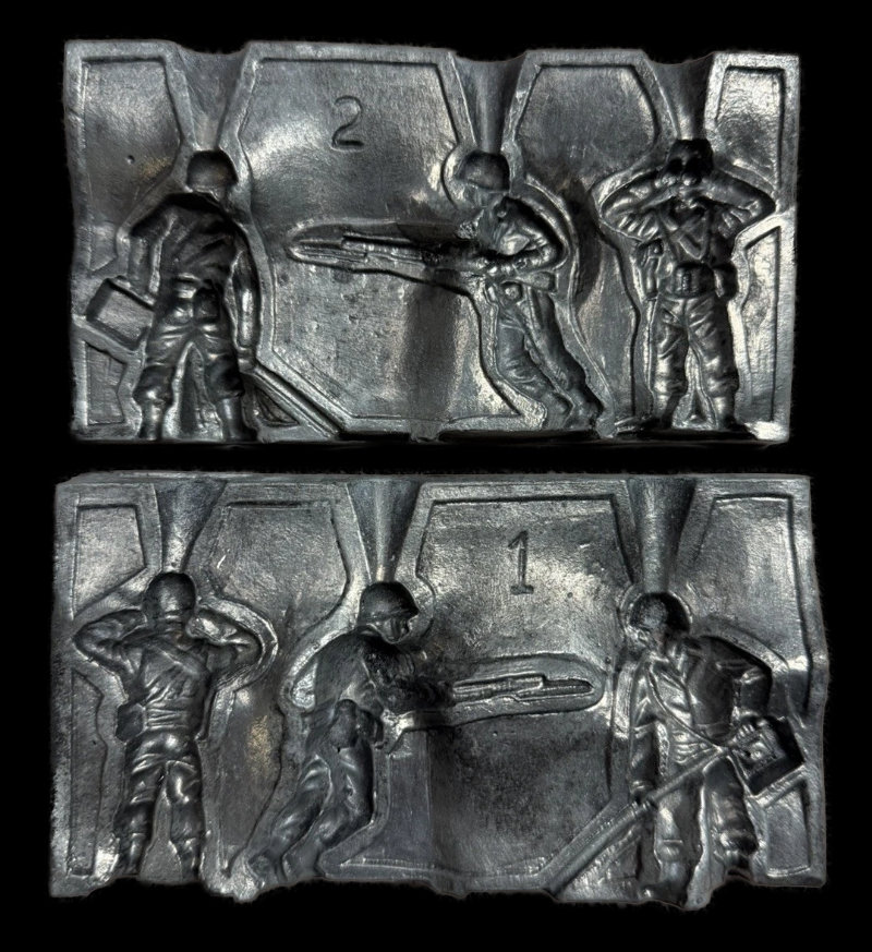 RAPCOThe RAPCO moulds started adding a "1" and "2" on the inside or face of the mould. i have not seen the number on the face with any other mould. The Back of the mould has the standard X cross support along with the threaded stud and the standard 4 digit number typical of home Foundry. This particular Mould is the 6090 - Mop Up Squad. |