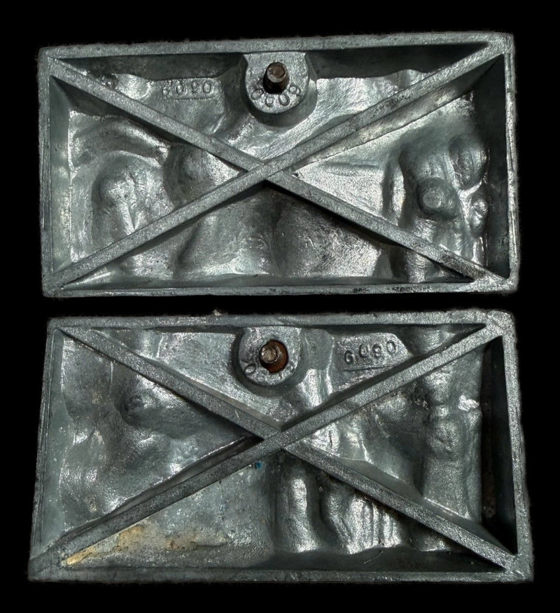 A. C. GilbertThere were 44 molds produced by the A. C. Gilbert Company. 29 semi flats and 15 slush molds. The square pair of moulds is for pouring solid models while the round pair is for pouring slush or "hollow" models. Not all moulds were numbered and sometimes the number is a patent number rather than a model number. |
