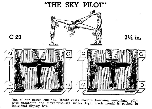 C23 Sky Pilot - Mould (approximately 2 1/4" figures) From Home Foundry and featuring modern low wing monoplane, Pilot with parachute and stewardess.