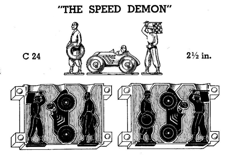 C24 The Speed Demon -Mould (approximately 2 1/4" figures) From Home Foundry and featuring Racing Car and Driver, Starter with Flag, and Mechanic with Tire.